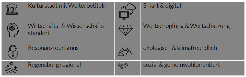 Ökonomisch möchten wir die Wertschöpfung für die Regensburger Anbieter:innen weiter steigern sowie den Tourismus stärker sektorübergreifend und standortfördernd mit der lokalen Wirtschaft Regensburgs verknüpfen, insbesondere zur Erhaltung einer lebendigen Altstadt. Dabei setzen wir auf touristisches Qualitätswachstum mit zu Regensburg passenden werteorientierten Gästegruppen (Milieus) sowie Zuwächse in Nischen und schwachen Saisonzeiten (Saisonglättung).